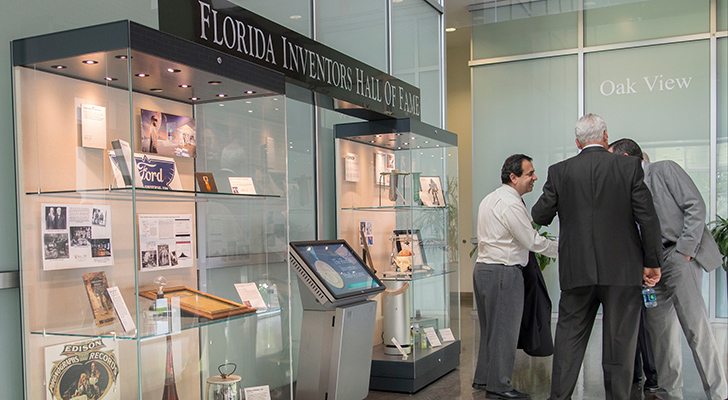 The new Florida Inventors Hall of Fame exhibit is located off the lobby of the Interdisciplinary Research Building in the USF Research Park.