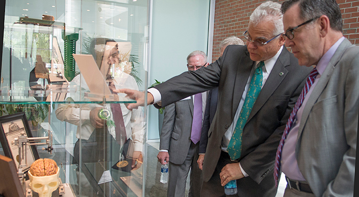 Some 125 attendees, including USF and community leaders, gathered in the Interdisciplinary Research Building’s Galleria for the summit. They had the opportunity to check out the nearby Tampa Bay Technology Incubator coworking space and the new Florida Inventors Hall of Fame Exhibit. The exhibit’s glass display cases, contain inventions by several inductees, including a modern replica of Thomas Edison’s first practical light bulb created in 1879 and an original can of Gatorade, the successful scientifically-formulated sports drink invented by the late James Robert Cade.